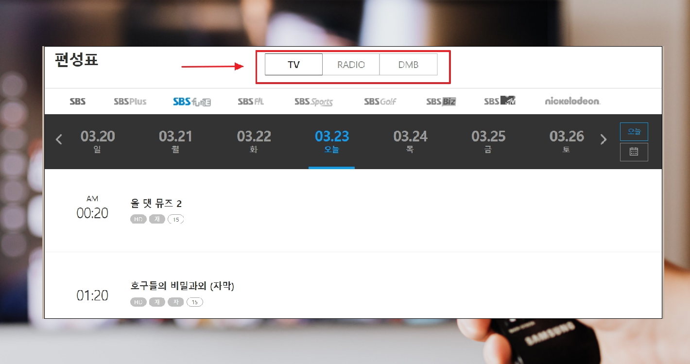 6. 편성표를 보면 TV 외에도 라디오와 DMB 편성표도 있음을 알 수 있습니다. 보고 싶은 방송을 이곳에서 보는 것이 가능합니다.