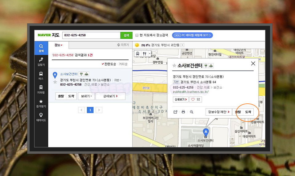 5. 지도 더보기 버튼을 클릭하면 네이버 지도가 열리는데요. 아까 전화번호로 찾은 장소의 위치가 나타나는데요. 해당 건물 혹은 집에 대한 상세 정보 확인도 가능해요. 도착 버튼을 누르면 현재 본인이 있는 위치에서 어떻게 갈 수 있는지 알 수 있어요.