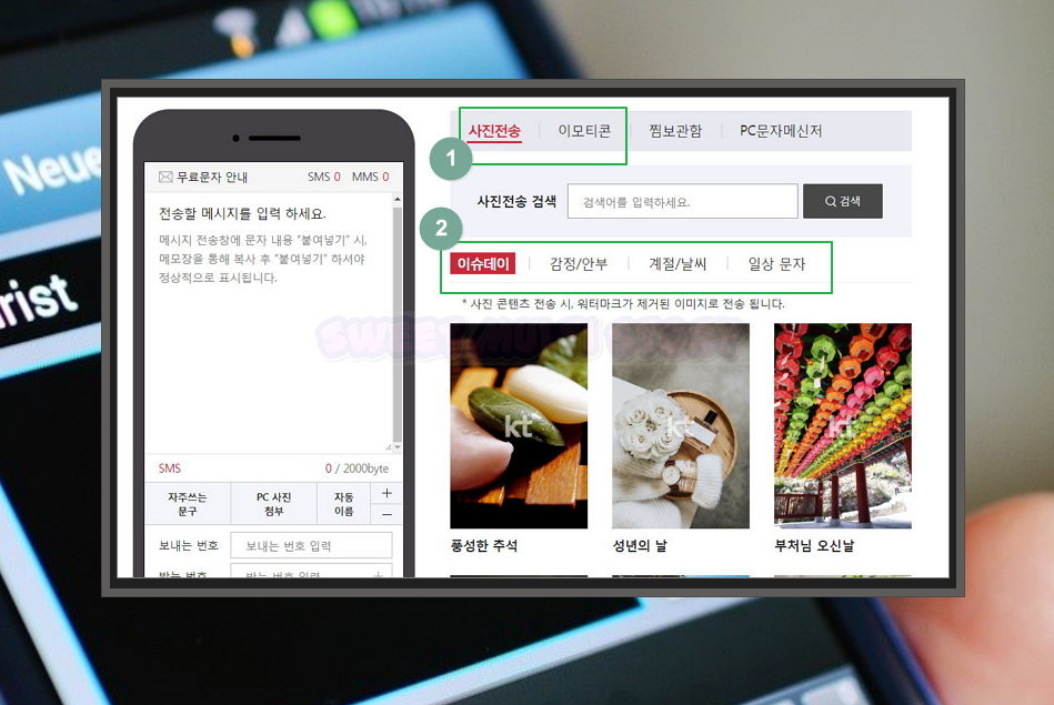 9. 제가 알려드린 방식으로 컴퓨터로 문자보내기 할 때 장점을 하나 더 알려드릴게요. 바로 통신사에서 제공하는 이모티콘을 이용할 수 있다는 점이에요. 보관 기능을 통해 메시지 관리도 가능하고요.