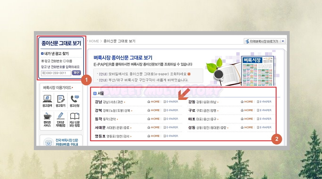 혹시 광고를 내셨다면 전화번호와 이름을 통해 ①번에서 찾아볼 수 있습니다. ②번에서는 종이신문을 볼 수 있는데요. 본인이 사는 지역의 오른쪽에 쓰여있는 E-PAPER를 클릭해주세요. 저는 서울-강남지역의 신문을 살펴보겠습니다.