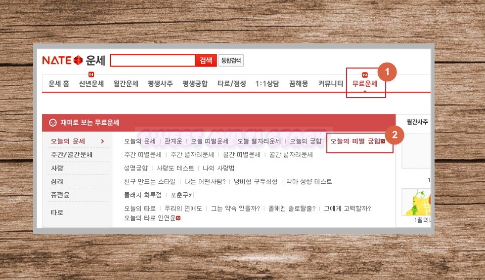 위에 언급한 것을 가진 사람들만 개띠와 연관이 있는 것은 아니 랍니다. 개띠와 잘맞는띠에 비해 영향력이나 약하겠지만, 다른 것에도 영향을 주는데요. 네이트 무료운세를 이용하면 쉽게 알 수 있습니다. '오늘의 띠별 궁합'을 클릭해주세요.