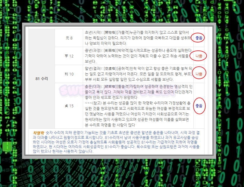 여기서는 초년, 중년, 말년, 총운을 확인할 수 있습니다. 저의 결과를 보니 초년운과 총운이 좋은편이고, 중년과 말년에는 고생을 좀 한다고 나와있네요.