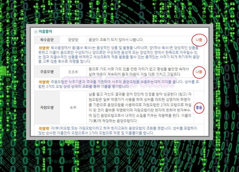 성명학에 근거하여 획수음양, 주음오행, 자원오행을 알아봅니다. 일반인은 알기 어렵죠? 그래서 오른쪽에 간단한 평가가 나와 있답니다. 풀이결과를 이해하기 어렵다면 참고해주세요.