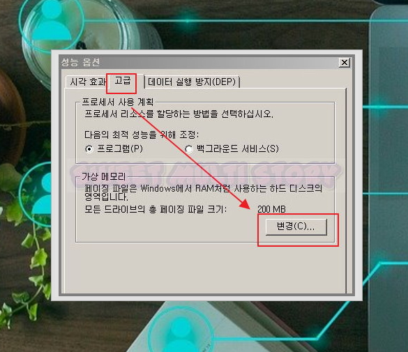 ▲ 고급탭에서 가상 메모리 변경을 클릭해주세요.