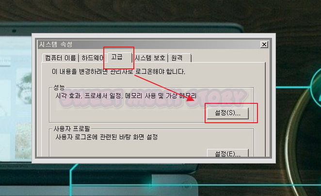 ▲ 시스템 속성 페이지에서 고급 탭으로 들어간 후 설정 버튼을 클릭해주세요.