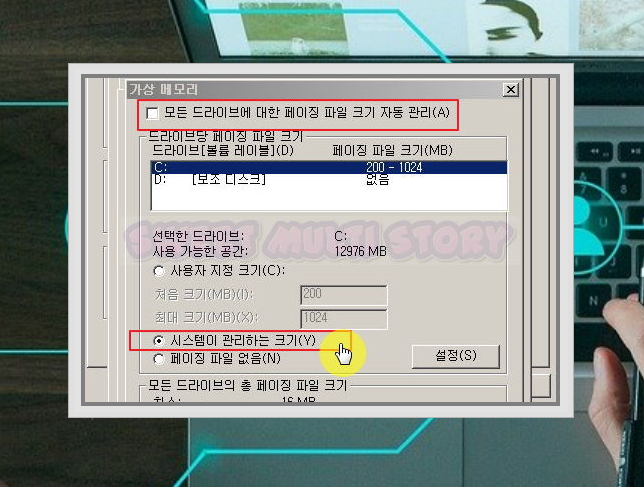 ▲ 자동 관리 부분은 체크를 해제하고, 시스템이 관리하는 크기에 체크를 해주세요.