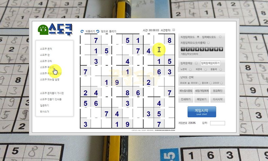 2) 사이트에 접속하자마자 스도쿠 문제를 풀 수 있습니다. 왼쪽에 보시면 규칙, 푸는법, 메뉴얼 등이 있으니 스도쿠를 어떻게 풀어야 하는지 모르는 분들은 참고하세요.