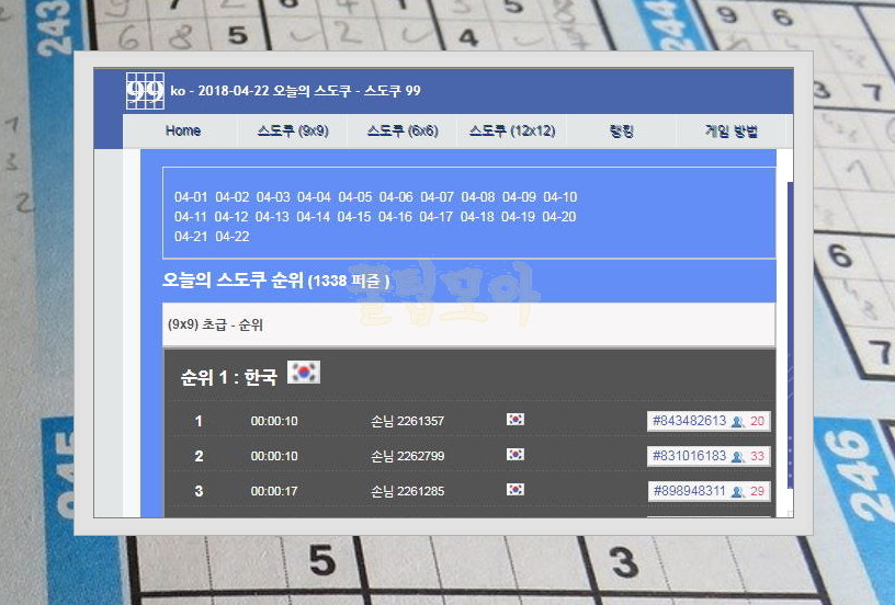 4) 두 번째 스도쿠 문제모음 사이트는 Sudoku99 입니다. 이곳은 순위를 알려주고, 다양하고 많은 문제를 접할 수 있습니다.