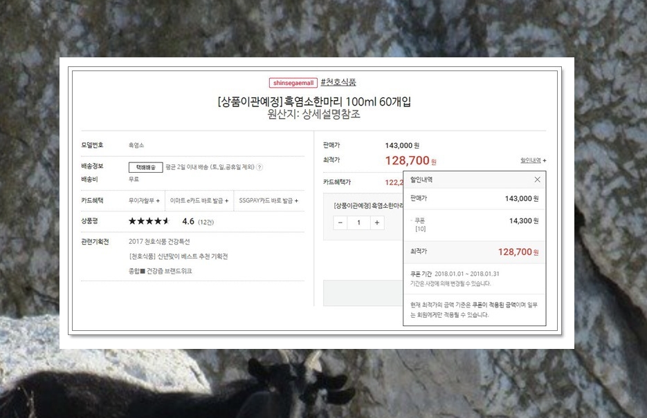 지마켓, 인터파크 등 오픈 마켓에서 좀 더 저렴하게 구입하실 수 있는데요. 신세계몰의 경우에는 흑염소한마리가격이 128,700원으로 저렴하게 구매할 수 있습니다.