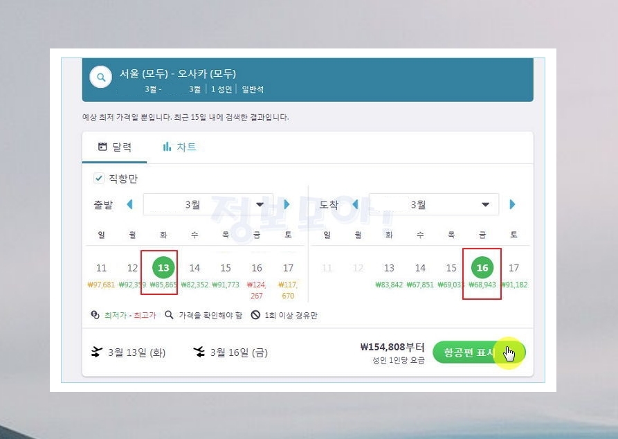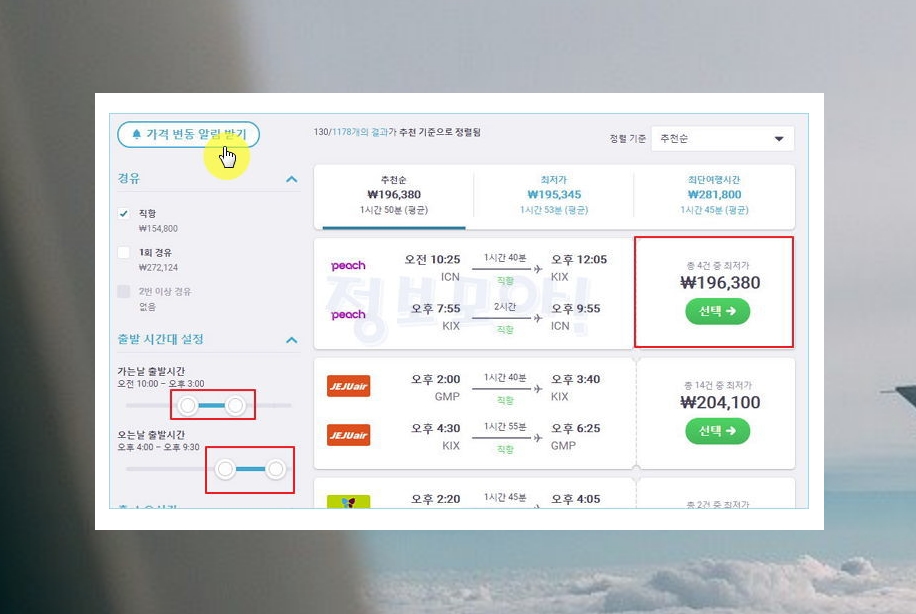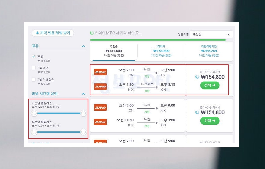 지금까지 제가 설명한 비행기표를 싸게 사는법을 제대로 따라하셨으면 위와 같은 결과가 나타납니다. 보통 오사카를 갈 때 이용하는 왕복항공권의 절반 수준의 가격인데요. 여기서 선택을 눌러 바로 예약하는 것이 가능하지만, 무작정 싸게 사는 것이 옳은 것은 아닙니다. 여행을 하는 경우에는 적절한 시간에 항공기 탑승하는 것이 좋겠죠? 좌측에 있는 가는날과 오는날의 출발시간을 조절해주세요.