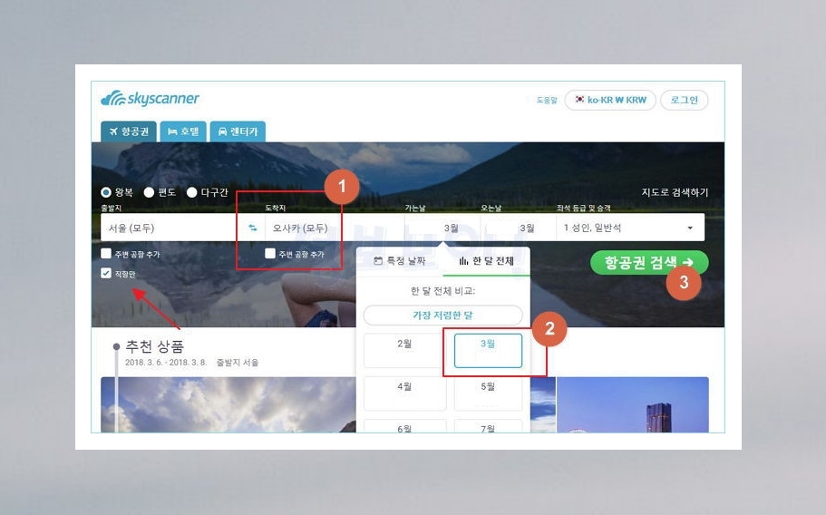 사람들이 많이 찾는 해외 여행지인 오사카를 여행한다고 가정하고, 비행기표 싸게 사는법을 자세히 설명해 드릴게요. 일단 출발지와 도착지를 입력해주세요. 일본은 가깝기 때문에 "직항만"을 체크해주셔야 합니다. 아무리 저렴해도 가까운 거리를 돌아서 가기는 무리이기 때문이죠.