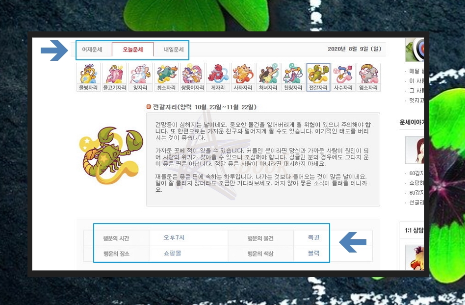 별자리로 보는 일간 운세도 있어요. 오늘은 물론이고, 어제와 내일에 대한 운을 살펴볼 수 있는데요. 별자리를 이용하는 경우 행운의 시간, 색상, 물건, 장소를 알아볼 수 있어요. 행운을 얻고 싶은 분들이 보면 좋을 것 같아요.