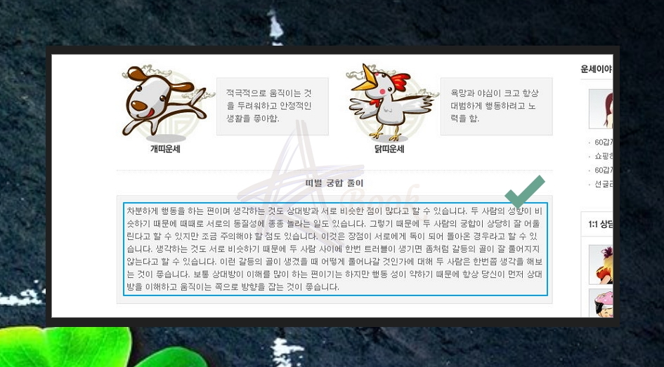 개띠와 닭띠를 선택해 보았어요. 각자의 운세와 함께 궁합에 대한 상세한 풀이를 읽어볼 수 있는데요. 궁합을 통해 서로가 잘 맞는지 알 수 있고요. 어떤 관계를 형성하고 있는지도 파악할 수 있죠. 더 좋은 관계가 되거나 현재 사이를 유지하기 위해 어떤 노력을 하면 좋은지도 알려줘요.