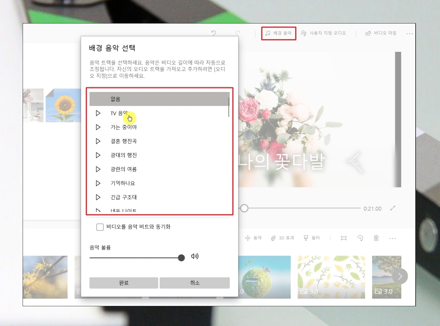 마지막으로 동영상에 꼭 들어가야 하는 배경 음악을 선택할 수 있습니다. 제가 이용하는 프로그램의 경우에는 몇 가지 배경 음악을 기본으로 제공하고 있습니다. 음악 볼륨 조절을 잘하는 것이 중요합니다.