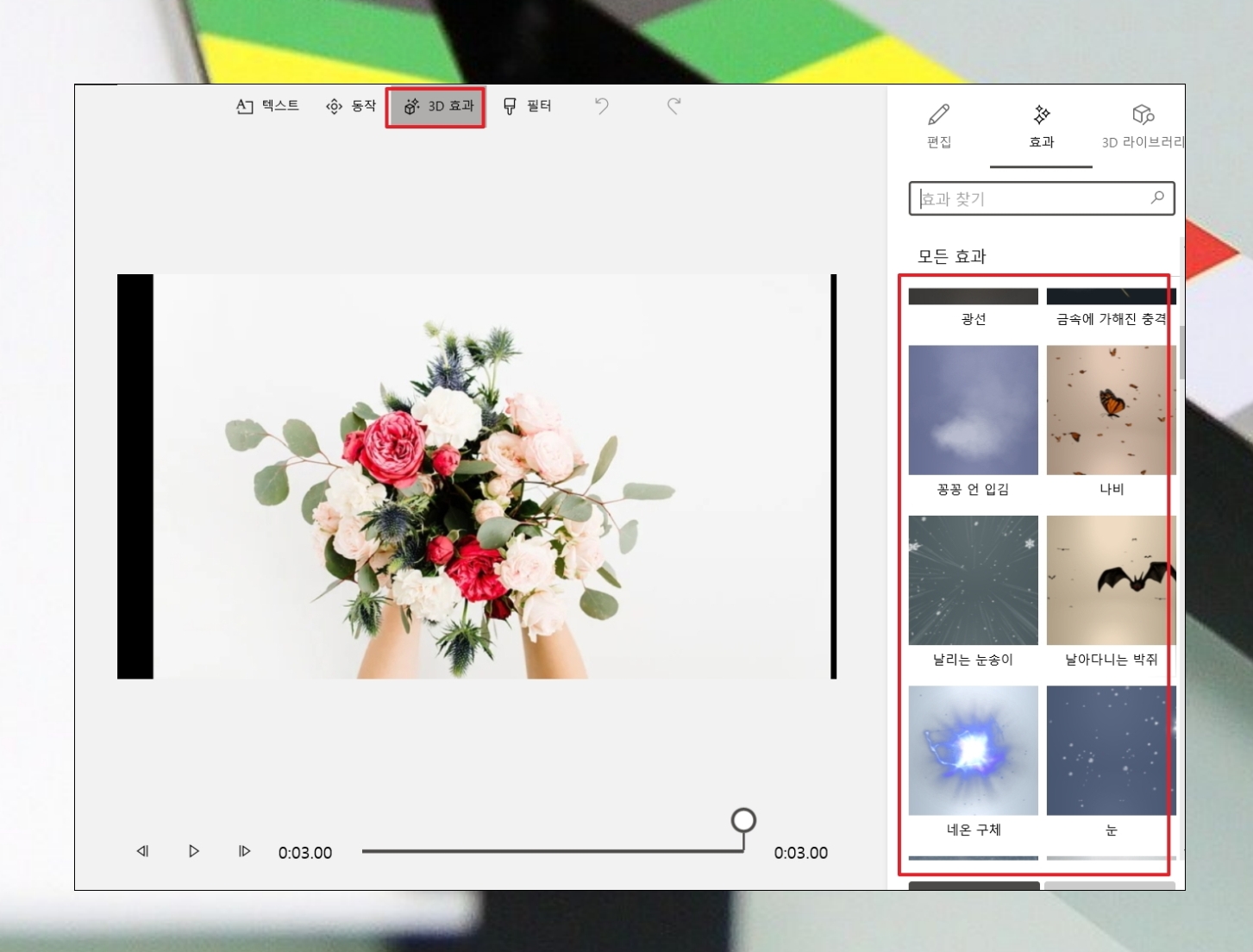 프로그램 하단에 있는 스토리보드를 통해 제작할 동영상에 들어가는 소스의 구성을 살펴볼 수 있습니다. 서로 순서를 바꾸면 영상에 나오는 순서가 달라집니다. 해당 소스가 재생되는 시간을 조절하는 것도 가능합니다. 스토리보드 상단에 보면 시간, 텍스트, 동작, 3d효과, 필터 기능을 사용할 수 있습니다. 멋진 작품 만들기 할 때 사용하면 좋은 기능들입니다.