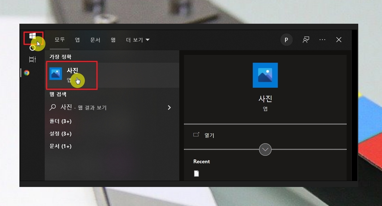 제가 이용하는 프로그램을 사용하면 사진이나 동영상 소스를 가지고, 쉽게 자르고 붙이기를 할 수 있습니다. 여기에 더하여 배경음악, 자막, 효과, 움직임 등 추가적인 편집을 손쉽게 할 수 있습니다. 윈도우10에 기본으로 설치되어 있는 소프트웨어이기 때문에 사용함에 있어 전혀 부담 없습니다. 해당 프로그램을 실행하려면 [윈도우 시작 버튼]을 클릭한 후 "사진"이라고 입력하면 됩니다. 그럼 앱 하나가 나타나는데, 해당 앱을 선택하여 실행합니다.