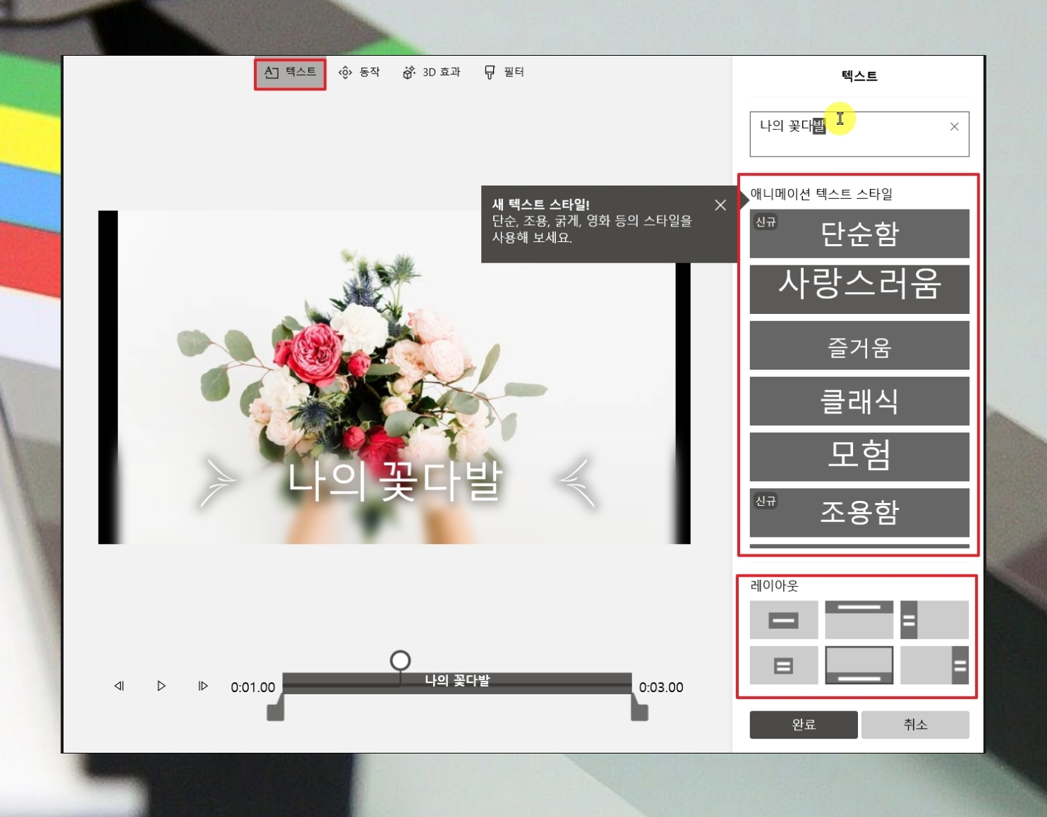 적재적소에 자막을 넣는 것이 좋습니다. 작품을 감상하는 입장에서 자막을 통해 내용 이해를 더 잘하게 되고, 재미 없는 영상이라도 자막을 통해 재미를 더해줄 수 있습니다. 자막의 성격에 따라 단순함, 사랑스러움, 즐거움, 클래식, 모험, 조용함 등 여러 종류가 준비되어 있으니 마음에 드는 것을 사용해 보시길 바랍니다.
