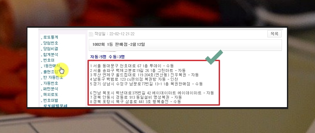메뉴에서 1등 판매처를 클릭해 봅니다. 그럼 특정 회차에 로또 1등을 배출한 지점을 알아볼 수 있습니다. 주소가 나와 있기 때문에 로또 복권 구매를 위해 방문할 수 있습니다. 당첨자가 수동으로 복권을 구매했는지, 자동으로 구매했는지도 확인이 가능합니다.