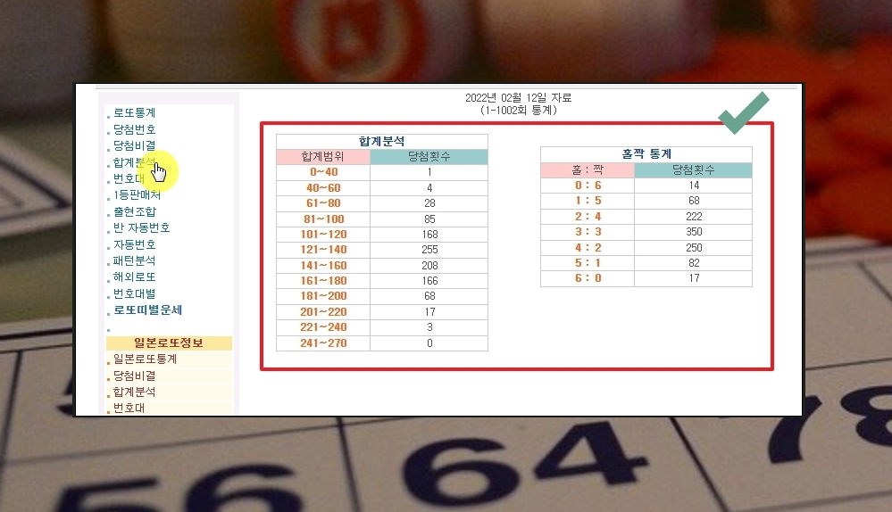 합계분석과 홀짝 통계 자료 또한 매우 유의미하다고 할 수 있습니다. 가장 많이 당첨된 합계는 121에서 140 사이임을 알 수 있습니다. 홀수와 짝수가 3개씩 분포되었을 때 당첨이 많이 되었다는 것도 알 수 있습니다.