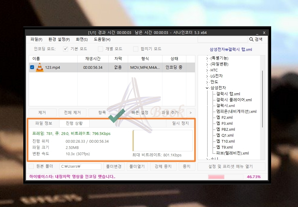 "빠른 설정" 또는 "프리셋"을 이용하여 설정을 완료했다면 프로그램 하단에 위치한 [인코딩 시작] 버튼을 클릭해 보세요. 그럼 동영상 변환 작업이 시작되는데요. "진행 상황" 영역을 통해 얼마의 시간이 걸리고, 얼마나 진행이 되었는지 확인이 가능합니다.