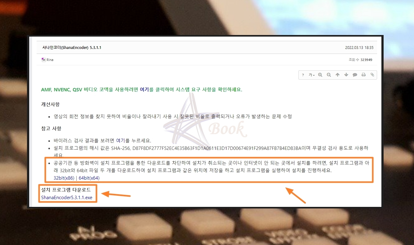 사이트에 접속하면 샤나인코더에 대한 설치 프로그램을 다운로드 받을 수 있어요. 참고로 AMF, NVENC, QSV 비디오 코덱을 사용하는 경우에는 시스템 요구 사항을 확인해야 하는데요. 안내 문구에 나와 있는 링크를 통해 쉽게 확인이 가능합니다. 그리고 일부 컴퓨터에서는 다운로드 차단이 될 수 있으니 인터넷이 안되는 곳에서 설치하는 방법을 사용하시길 바랍니다.