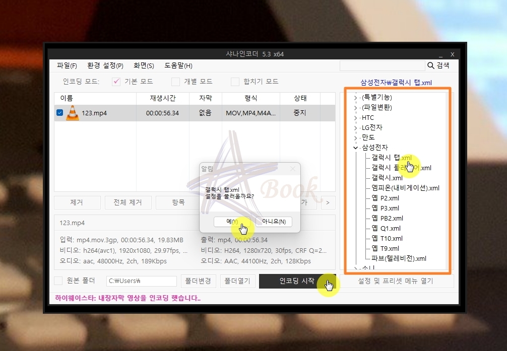 이번에는 프리셋 기능을 사용해 보겠습니다. 일일이 변환을 하려는 값을 입력할 필요가 없어서 정말 편리한데요. 프로그램 화면에서 맨 우측에 보면 다양한 제조사와 스마트 기기 이름이 표시되어 있습니다. 여기에서 해당 동영상 파일을 재생하고자 하는 스마트 기기의 이름을 클릭해 보세요. 그럼 설정을 불러올 수 있는데요. 해당 기기에서 원활하게 재생할 수 있는 설정값으로 셋팅을 할 수 있습니다.
