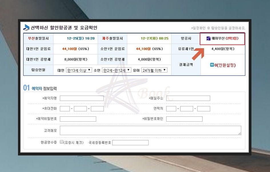 마음에 드는 제주항공권을 선택하셨다면 예약하는 페이지로 이동하는데요. 간단한 정보와 함께 결제하시면 예약하실 수 있답니다. 티켓은 출발하기 1시간 전에 부산에 있는 항공사 카운터에서 신분증을 제시하고 예약번호를 알려주면 제주도행 티켓을 받을 수 있습니다.