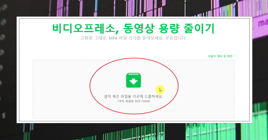 동영상 줄이기 방법은 간단해요. 화면에 나타난 공간에 용량을 줄이고 싶은 파일을 드롭하면 됩니다. 이곳은 최대 100메가까지만 가능하오니 이점 참고해 주세요.