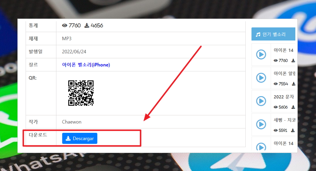 6. 오디오 플레이어 아래에는 평점, 발행일, 장르, QR 코드, 작가 정보가 나타나고요. 그 아래에는 벨소리 다운 및 추천 받는 곳이 있습니다.