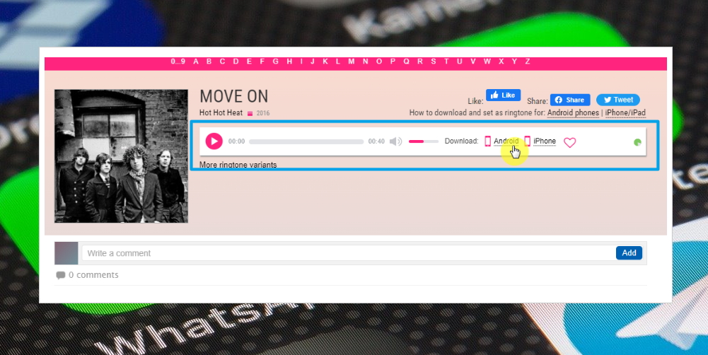 11. 앨범을 선택한 후 마음에 드는 곡을 클릭하면 다음과 같이 벨소리 음원 파일을 다운받는곳으로 이동하게 되는데요. 여기서는 아이폰과 안드로이드폰 두 가지 버전으로 벨소리 음원 파일을 제공하고 있습니다.