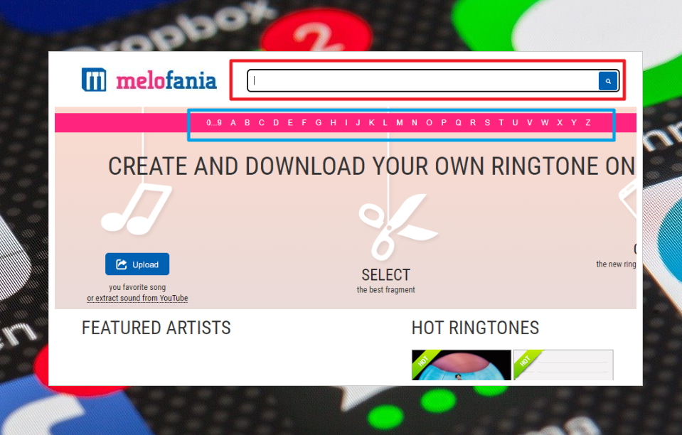 9. 여기는 해외 사이트이기 때문에 영어로 되어 있는데요. 크게 어려운 부분은 없습니다. 화면 상단에 검색창에서 찾고자 하는 음원의 이름을 검색해 보세요. 그 아래에는 가지고 있는 음원 파일을 벨소리 파일로 변환하는 서비스가 있습니다.