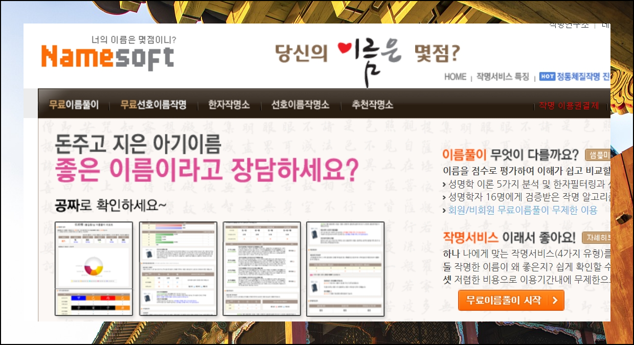 온라인 운세 서비스와 같이 인터넷을 이용한 작명 서비스도 알차게 이용할 수 있습니다. 이곳에서 제공하는 작명 프로그램의 경우 성명학 이론을 토대로 하는 것이기 때문에 전문적인 기준에서 높은 평가를 받는 이름을 짓기에 안성맞춤 입니다. 그럼 간단한 검색을 통해 접속해 주세요.