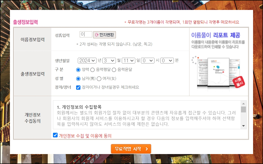 제대로 된 이름짓기를 하기 위해서는 "출생정보"를 정확하게 입력해야 하는데요. 일단 본인의 성 씨를 한자로 입력하고, 생년월일, 성별, 장녀 또는 장자 여부에 대해 정확하게 입력하시길 바랍니다. 이런 것을 미루어 보았을 때 같은 성명라도 사람에 따라 좋고 나쁨이 다를 수 있다는 것을 알 수 있어요.