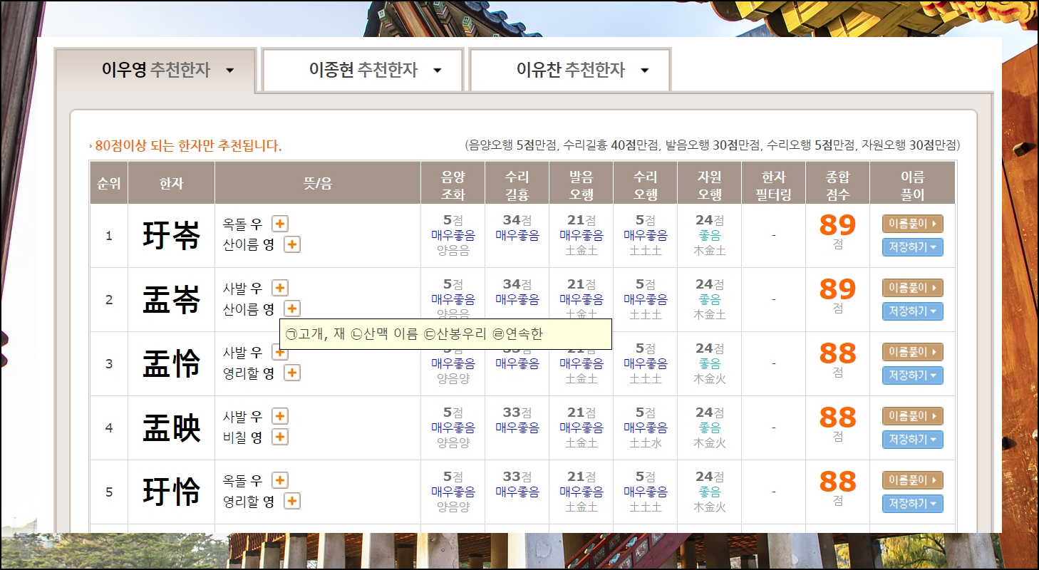 3개의 이름을 선택한 상태에서 "사주에 맞는 추천한자 보기" 버튼을 누릅니다. 그럼 이렇게 각 이름에 사용하면 좋은 한자를 5개씩 얻을 수 있는데요. 성명학에서 중요하게 여기는 음양조화, 발음오행, 수리오행, 자원오행, 수리오행 을 기준으로 높은 점수를 받는 한자가 무엇인지 알 수 있습니다. 이 중에서 가장 마음에 드는 것을 서택한 후 [이름풀이] 버튼을 눌러보세요.