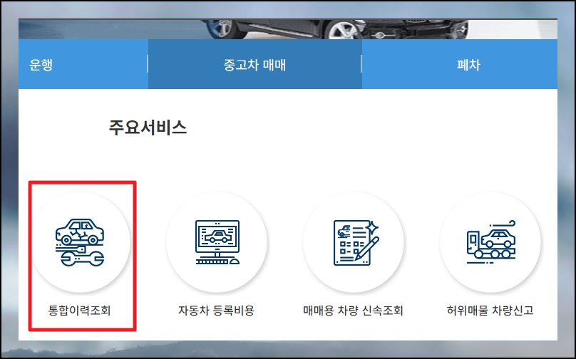 2. 사이트 메인화면에서 "중고차 매매"를 선택해 주세요. 차량 번호판을 가지고, 다양한 정보를 얻고자 한다면 통합이력조회를 선택하셔도 됩니다. 다만 중고차 매매를 하기 위해서 알아보는 경우라면 여러 가지 유용한 정보와 서비스를 함께 살펴볼 수 있는 "중고차 매매" 메뉴를 선택하는 것이 나아요.