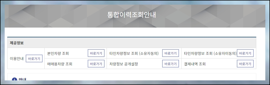 3. 중고차매매 페이지에서 "차량 이력조회" 메뉴를 선택해 주세요. 보시는 바와 같이 해당 페이지에서는 중고차를 매매할 때 알면 도움이 되는 가이드나 조회 서비스를 제공하고 있습니다. 차량 번호판 조회를 하고 싶은 경우에는 이력조회 카테고리에 있는 것을 선택하면 됩니다.