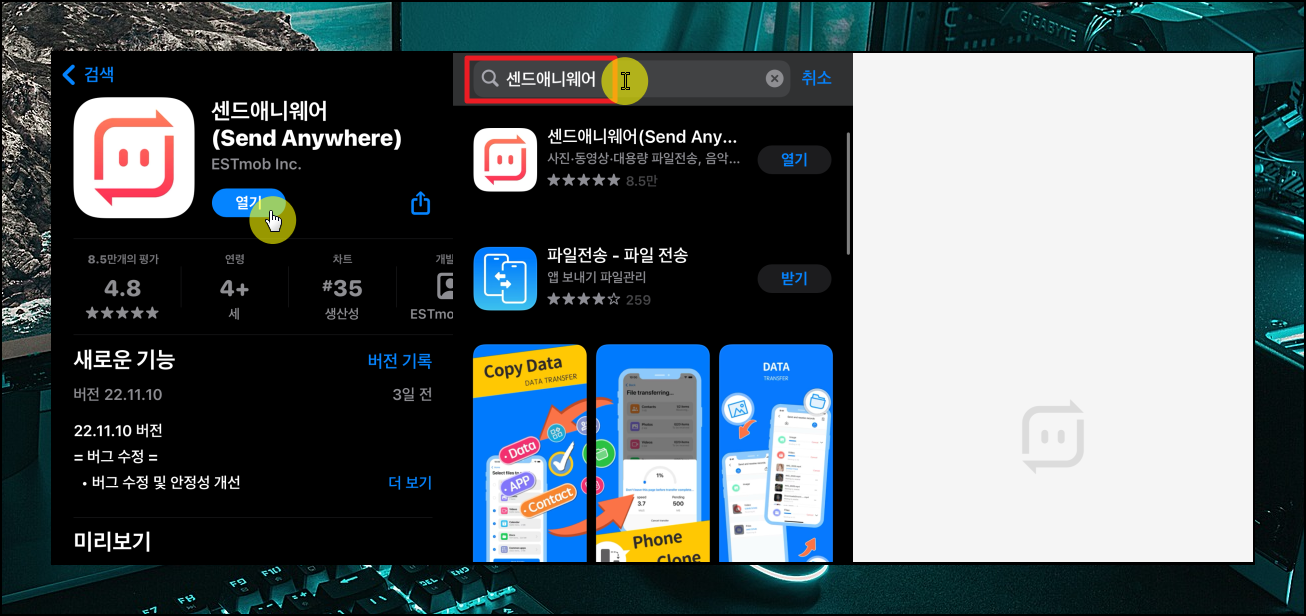 일단 휴대폰에서 어플을 하나 받아줘야 합니다. 사진을 옮기는 것에 있어서 별다른 제약 없이 무료로 사용할 수 있는 어플입니다. 아이폰은 앱스토어에서 갤럭시 시리즈와 같은 안드로이드폰은 구글 플레이 스토어에서 센드애니웨어를 찾아서 설치해 줍니다.