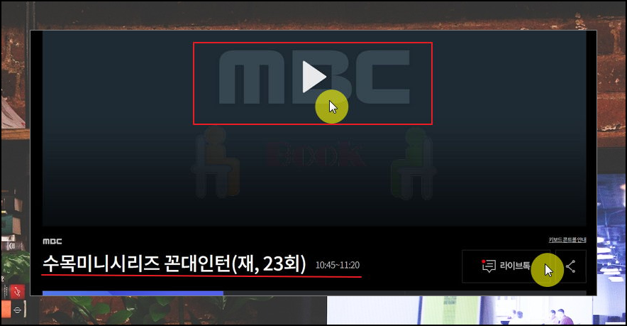 온에어 페이지가 열렸어요. MBC 채널을 틀면 실시간으로 방송이 되고 있는 수목미니시리즈 꼰대인터 23회가 나타났네요. 이렇게 컴퓨터를 TV처럼 사용하고 싶을 때 MBC 사이트의 온에어 서비스를 이용하면 좋아요.