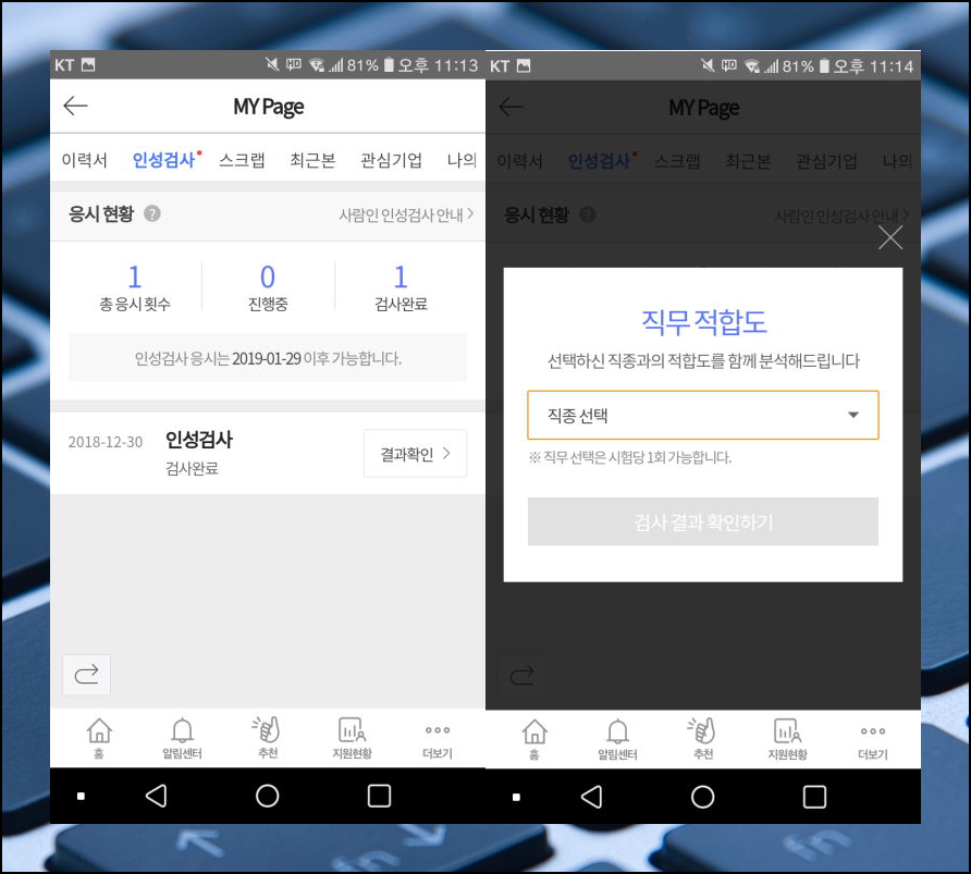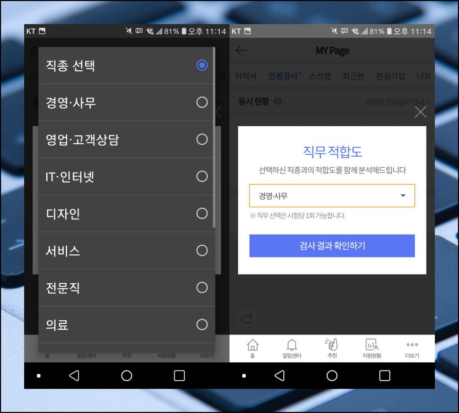 인성검사가 완료되면 사람인 어플을 통해 결과를 바로 확인할 수 있습니다. 결과를 확인하기 이전에 자신이 지원하고자 하는 직종을 선택해야 해요. 그래야 해당 직종과의 적합도를 알 수 있어요.