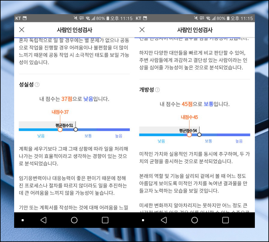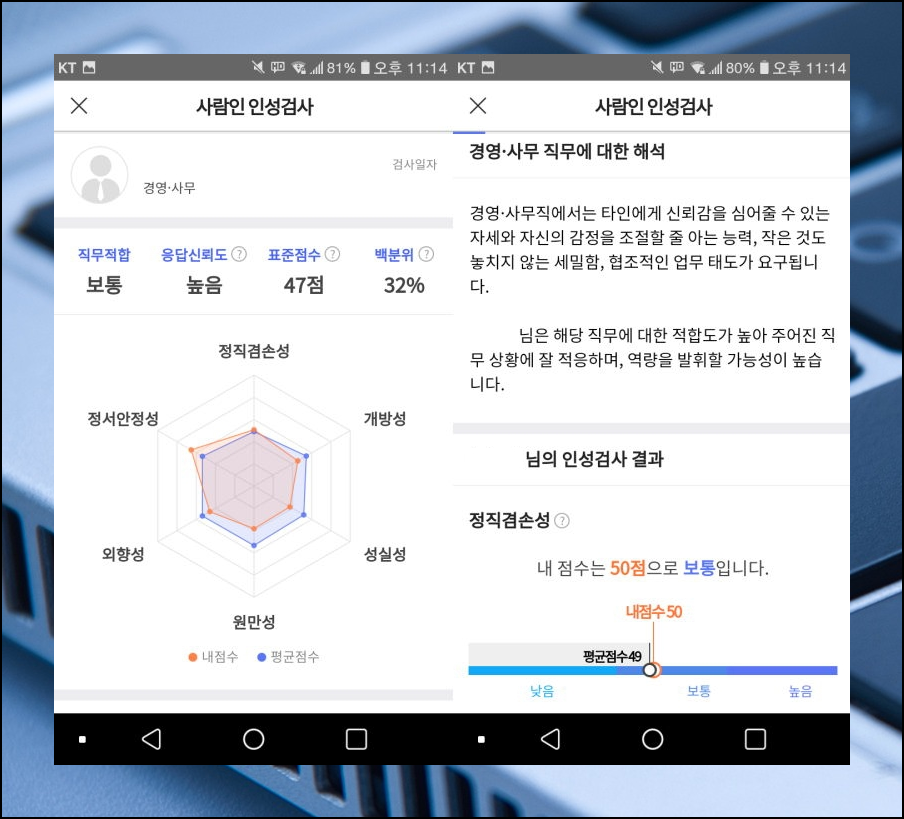 결과가 나왔습니다. 직무적합도, 응답신뢰도, 표준점수, 백분위는 물론이고, 앞서 언급드렸듯이 인성에 대한 그래프가 나타났네요. 사람인 어플에서는 각 항목에 대한 평균점수를 알려줍니다. 이것을 근거로 자신 인성이 어느 정도 위치에 속하는지 알 수 있어요.