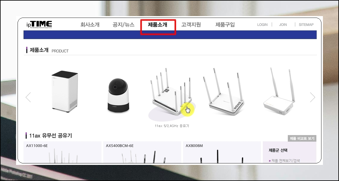 iptime 사이트에 접속하면 설치도우미를 다운 받기 전에 메뉴에서 [제품 소개]를 선택해 주세요. 그 다음 자신이 사용하는 유무선 공유기 또는 기타 기기를 선택합니다.