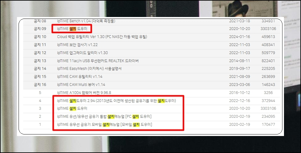 여러 가지 자료를 선태할 수 있는 게시판이 열렸는데요. 여기에서 자신에게 맞는 iptime 설치도우미 프로그램을 선택하면 됩니다. 앞에서 출시년월을 확인했었는데요. 그것을 참고하여 게시물을 선택하면 됩니다.
