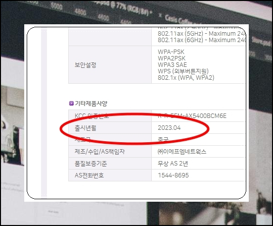 저는 11ax 유무선 공유기에 해당하는 AX5400BCM-6E 모델을 선택했는데요. 이에 대한 갤러리, 상세스펙, A/S 정보, 리뷰 등을 선택할 수 있습니다. 여기에서 "상세 스펙"을 선택해보세요. 그럼 기타 제품 사양 카테고리에서 "출시년월"을 확인할 수 있는데요. 여기에 표시된 "2023.04"를 기억해야 합니다.