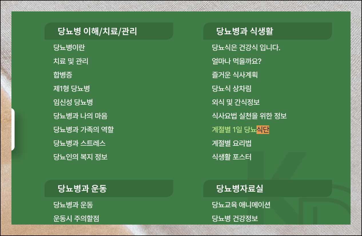 사이트에서 제공하는 다양한 메뉴 중 식생활 섹션을 선택하면 계절별 당뇨 식단표를 확인할 수 있습니다. 이를 통해 손쉽게 1주일 식단을 구성해보세요. 매 끼니를 건강하게 준비할 수 있어요.