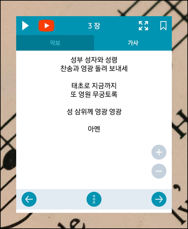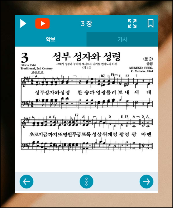 성부 성자와 성령을 비롯한 모든 곡에는 가사와 악보가 함께 있어요. 가사를 보며 따라 부르기 좋고, 악보도 크게 볼 수 있어 편리합니다. 북마크 기능으로 자주 부르는 찬송가를 저장해두세요.