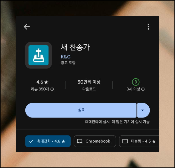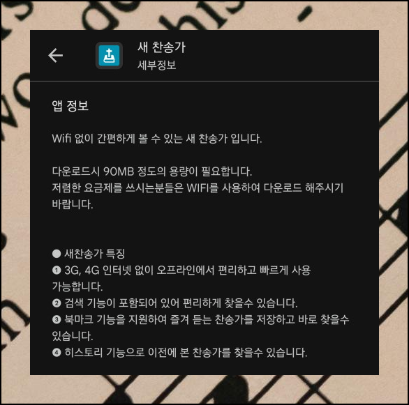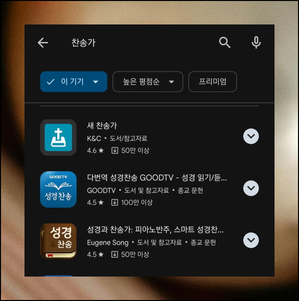 구글 플레이스토어에서 새로운 모바일 앱을 소개해드립니다. 검색창에 새 찬송가를 입력하시면 금방 찾을 수 있어요. 50만 건이 넘는 다운로드 기록이 이 앱의 인기를 증명하죠. 다른 사용자들의 리뷰도 검색해보시면 도움이 될 거예요.