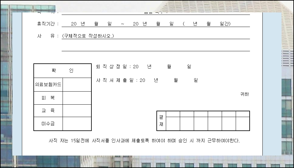회사의 업무 공백을 최소화하기 위해서는 미리미리 준비하는 게 좋아요. 회사에서도 새로운 직원 채용을 해야 하고, 그 다음 사람에게 업무 인수인계를 해야 하기 때문입니다. 그렇기 때문에 30일 이전에는 퇴사 의사를 전달하는 것이 좋아요. 그러면서 사직서 쓰는 법을 미리 숙지해야 합니다. 어떤 내용을 작성할 지 미리 생각해 놓아야 하거든요. 이러한 부분은 제가 제공해 드린 무료 양식을 활용하면 쉽게 해결이 가능합니다.