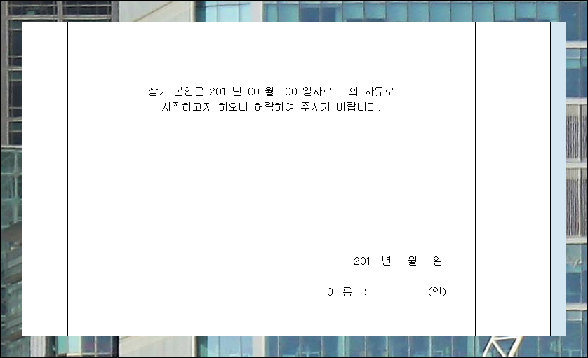 혹시 회사에서 자세한 퇴사 사유를 요구한다면 육하원칙에 따라 작성하면 됩니다. 이러한 경우 간단히 힌트를 드리자면 사직서 샘플을 따라 쓰는 방법을 이용해 보세요. 대부분 퇴사하는 이유가 비슷비슷하기 때문에 자신과 같은 상황에서 사직서를 쓰는 사람의 글을 쉽게 찾을 수 있을 겁니다.