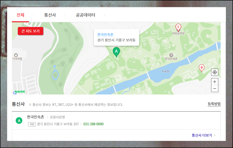 검색 결과는 한눈에 들어오도록 구성되어 있습니다. 상호명과 주소는 물론 지도까지 표시되어 위치 파악이 쉬워요. 모르는 업체의 통신사 정보도 함께 제공되니 더욱 믿을 수 있죠.