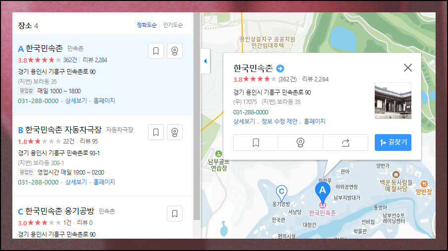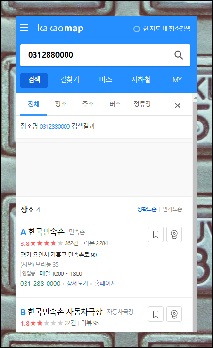 지도의 강자 카카오맵도 번호 검색이 가능합니다. 익숙한 서비스에서 새로운 기능을 발견하는 재미가 있네요.